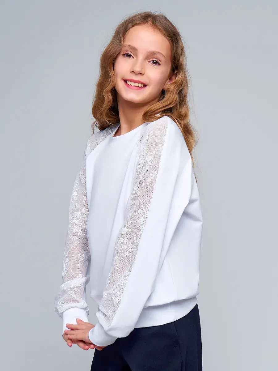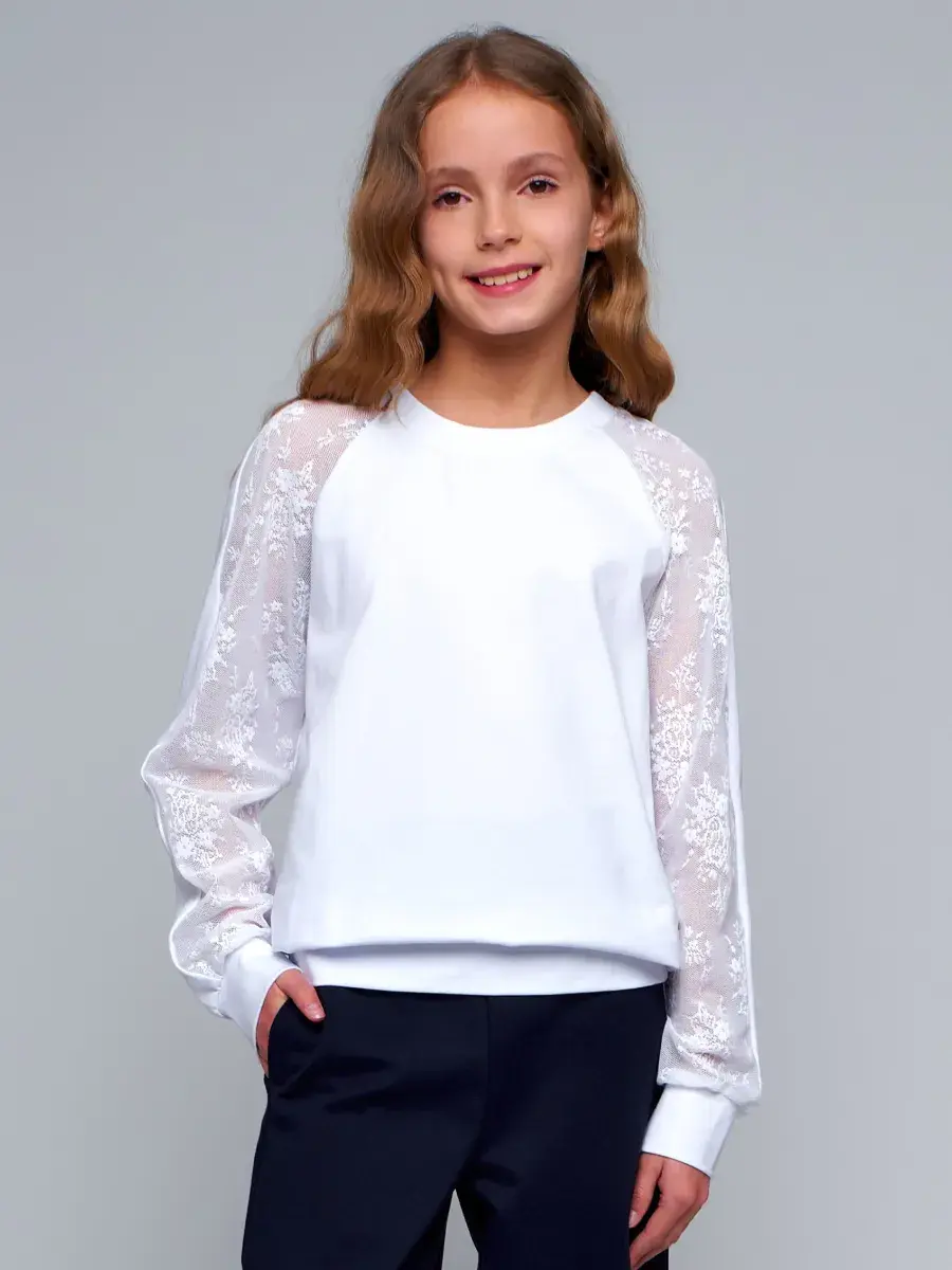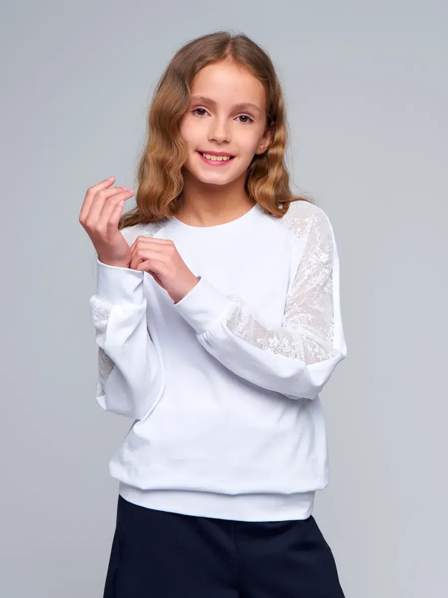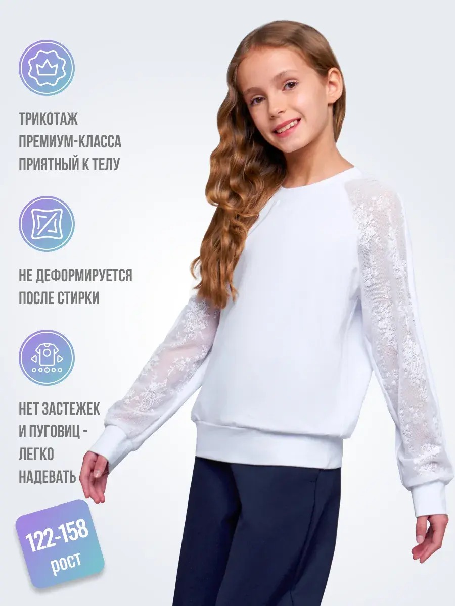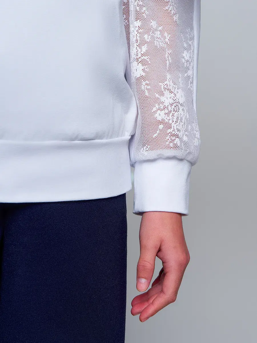 Стильная модель для девочек-подростков выполнена из эластичного трикотажа и гипюра, отличается практичностью и износостойкостью, что делает её отличным выбором для школьной формы. Сочетание классического стиля и современных тенденций делает детскую блузу актуальной для повседневной носке и для особых случаев осенью, весной или зимой.